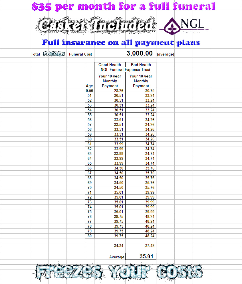 Don't let any funeral home salesperson convince you that a guaranteed, pre-paid funeral with insurance has to cost $100 per month. Get real. $35 per month is enough to get what you want.