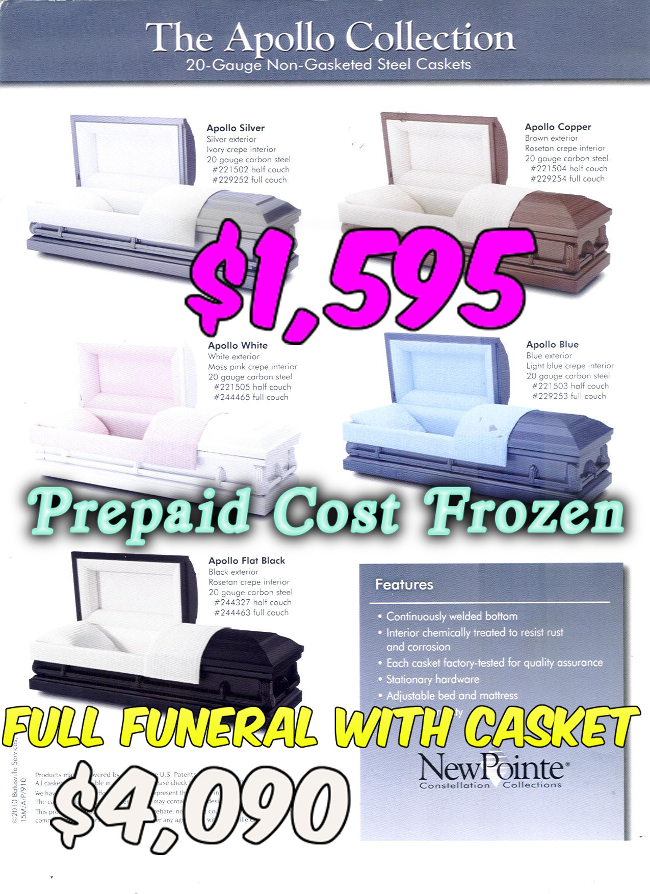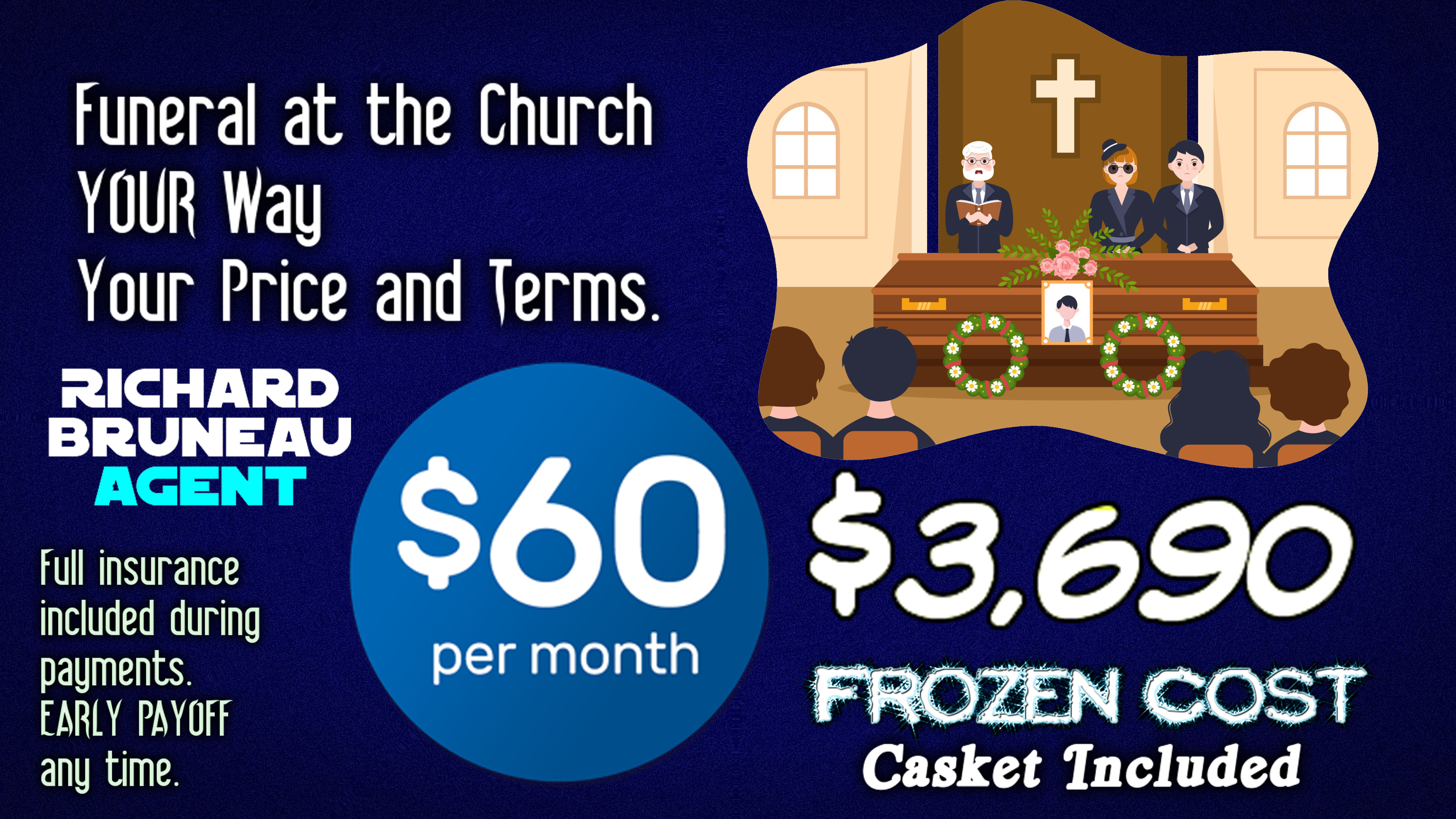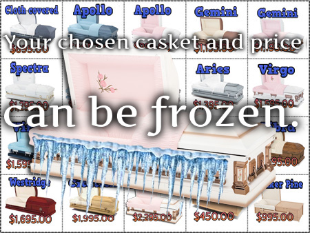 This is one reason funeral homes offer “pre-need" contracts, which “freeze" a large percentage of your total funeral and burial costs, regardless of future price increases, have monthly payments up to ten years, and have growing cash value for the rest of your life. The growing cash value is to cover both the guaranteed and estimated items in your plan. You don’t have to make payments your “whole life.” You are done in 10 years or less, whenever you decide. Then odds are good your total funeral and burial are paid with no money due at the time of death. If you are lucky, some money may be refunded.
