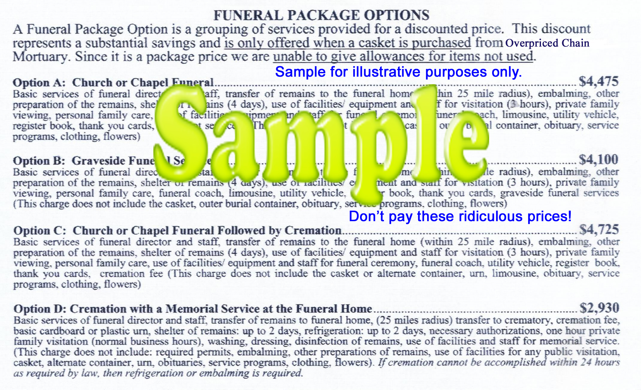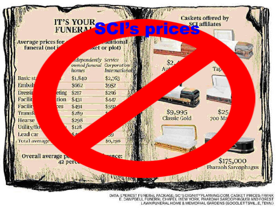 1. Pricing and profits are too often more important than service. Chain funeral homes are normally “publicly traded companies,” which means they are accountable to their stockholders for continued profit year after year. This frequently means continual price increases, year after year. 2. Most of them don’t give you a discount on services if you use your church instead of their building. They claim it’s just as much or more work for them to use your church. The reality is that they want to charge you the higher price for services, because it is the price they need for high profits. But even private funeral homes do this. 3. Chain funeral homes have a higher turnover of employees, and that includes morticians/ funeral directors, salespeople, and managers. This translates into lack of long-term consistency of service and a higher probability of errors being made at your family’s expense. 4. Chain funeral homes most often force you to use their funding companies, insurance companies that are part of the same larger conglomerate corporation, no matter how expensive it is for a plan. Privately owned funeral homes, on the other hand, often offer you multiple funding sources. They usually have no vested interest in the company they use. They simply use whichever they feel is best for the family or for themselves. 5. You’re more likely to get “cookie cutter” service than service that meets your family’s exact needs and wants. And this can include casket price fixing.