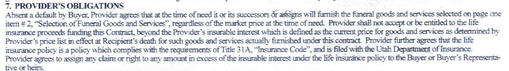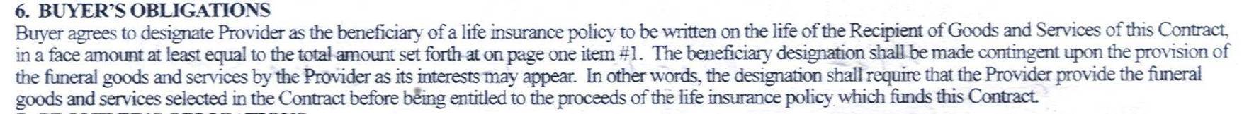 The buyer agrees to purchase a life policy with the funeral provider as beneficiary with a "face amount" equal to the total amount of the funeral: