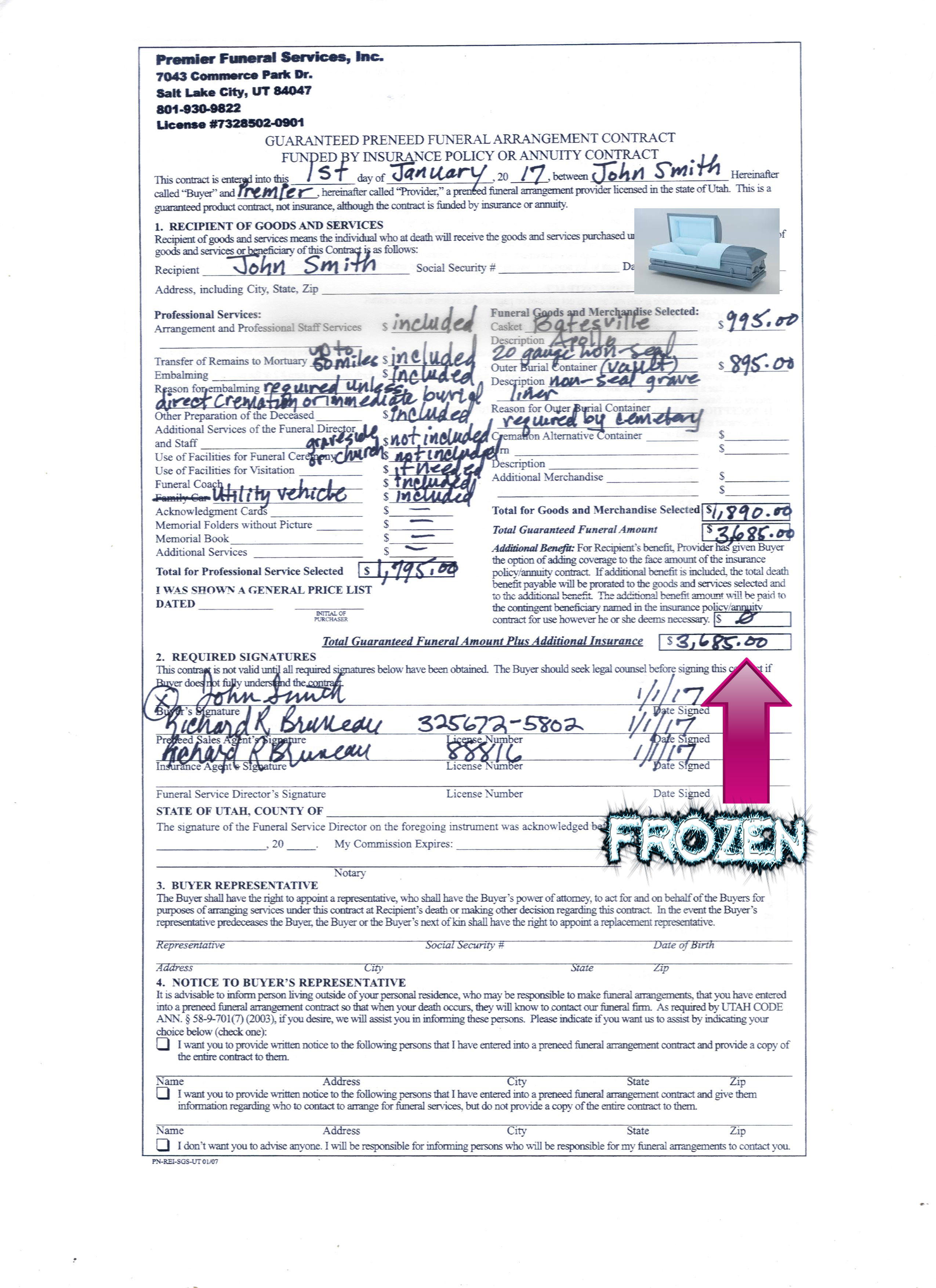 In the sample guarantee form below, which contains information about exactly the types of plans I write on a regular basis, all the costs are frozen to the extent of John Smith's investment. If Premier Funeral Services is charging $2,995 for services, $1,200 for the same Apollo White casket, and $1,000 for a burial vault by the time he passes away, no one is required to come up with a balance. His costs were "frozen" on March 31, 2015, the day the contract was written--at a total price of $3,785. I use Premier Funeral Services in this illustration because I believe they are the best value for your money. (Premier is currently offering the same services package for $1,795. Casket and vault are extra). I do not work for or get paid any money by Premier Funeral Services. I independently fund for other funeral homes as well.