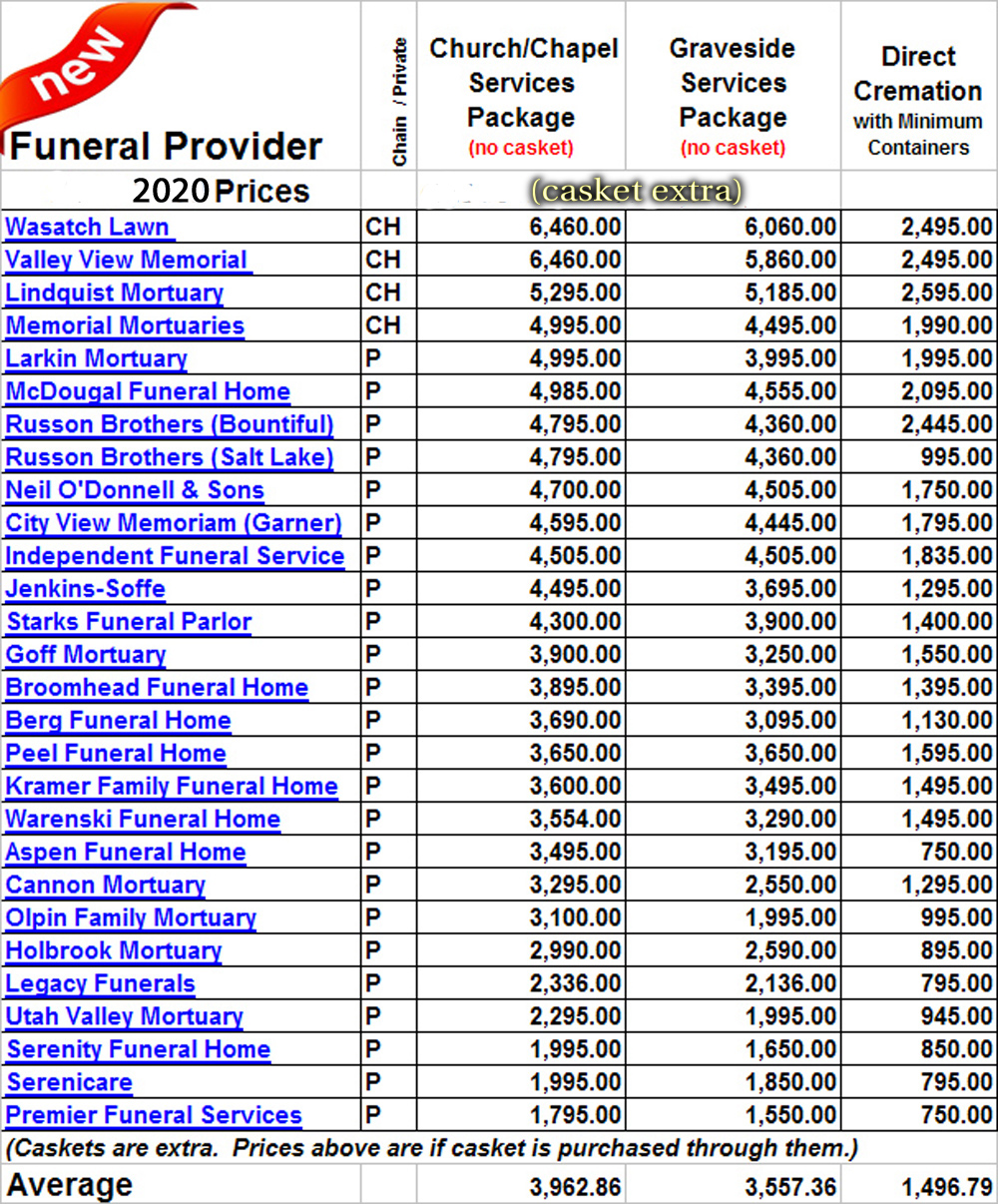 Here is a survey of funeral service providers in the Salt Lake area.  Services are package offerings without casket: