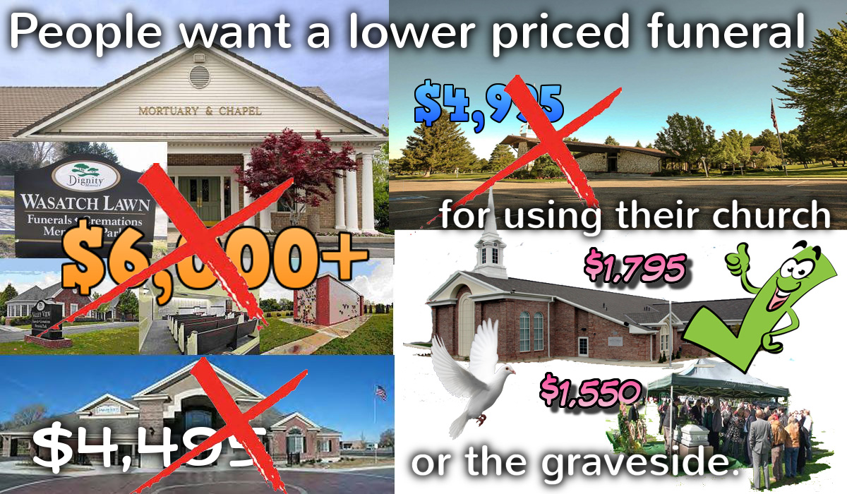 This isn't even the worst news. Your favorite, family-owned funeral home may have been purchased by Service Corporation International, the big conglomerate that gobbles up as many funeral homes and cemeteries as it can buy out. SCI purchased Valley View Memorial Park and Funeral Home and Wasatch Lawn. They may still appear to you as the same family-owned funeral homes they once were, but the reality is that now they are operated by a big corporation and their prices are highest of all. I haven't done a comparison of their funding, but rest assured it is even worse than Security National Life and Forethought. Their full funeral service with casket, even if you use your church, is in the neighborhood of $9,000 (if you pay now with one check, $18,000 to $20,000 if you fund over ten years).
