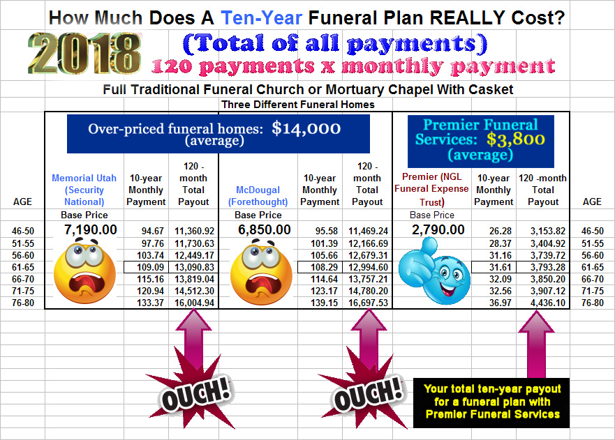 If you think your favorite funeral home is worth the higher prices they charge, you don’t have to use their funding insurance company, which may be too expensive for you. Use them if you feel you should for the funeral itself, but consider using an alternative funding company like National Guardian Life--which is the largest of the funeral and final expense funding companies. I have done side-by-side comparisons of what their plans costs for the same dollar amount to Security National Life, Forethought, and Security National Life. These companies funeral funding is expensive, unless you get it done in a few years or less. And early payoff may not even be an option after a couple or three years have passed. You are then stuck with the "whole enchilada" of ten years' worth of payments no matter what. You can have the benefits of guaranteed costs but still be over-charged greatly and get buffaloed. That won't happen with me, because I know how all the plans work and steer you toward only the good plans.