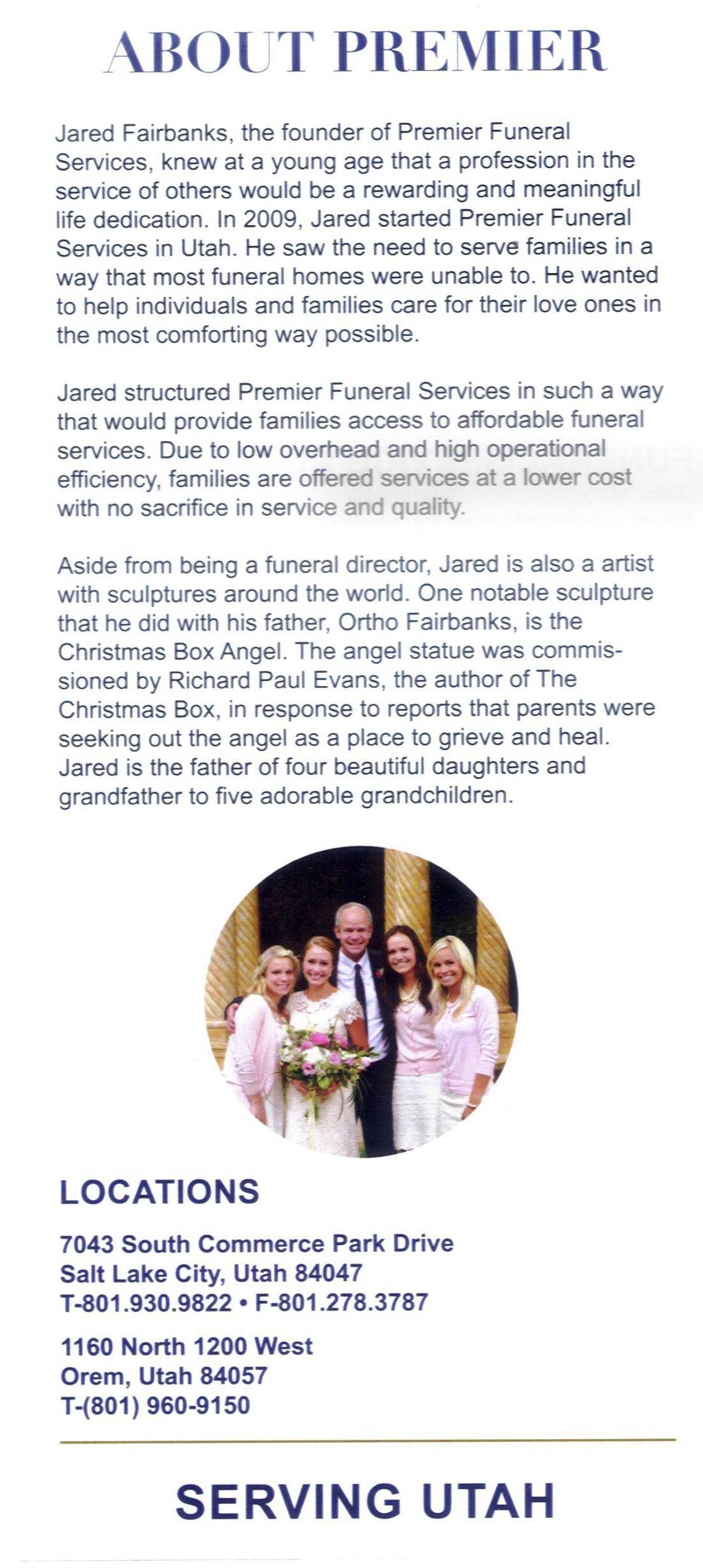 Over a period of 25 years, I have represented many cemetery and funeral operations. Most of what I have done for these companies is arrange “pre-need” contracts. What I have learned about the funeral industry over these years is explained throughout this Web site. But the most important things I have learned are who are the best values for your money when arranging a funeral and who the best funding company is. I am loyal to no company on the basis of my profits as many funeral home representatives are. Too many of them are in “golden handcuffs,” which means essentially that they are addicted to the money (bonus and commission) they are paid by the funeral home, funding company, or both. For me at this point, it’s not “about the money”—except yours. Below are some of the best values for your money. But they are not better in order of the prices they charge. Good values are not based on price alone. The best value for your money must consider all of the following: 1) total experience of the staff; 2) whether the ownership is "on site"; 3) their financial condition; 4) how their sales are growing via "word of mouth"; and 5) how good their pre-need funding options are. I have considered all these factors for a long list of funeral homes. Premier Funeral Services measures up in all these respects. Why I Rule Out Almost All of the "High-Profile" Funeral Homes I make more money if I fund a plan for a more expensive funeral home. In years past, as an agent I’ve been forced to be part of the bunch that thinks of “sales” in terms of their income, which is more important than giving your customer a good value. And these years have taught me that giving a good value and personalized service are less important to many operations than the “numbers,” especially those numbers analyzed by those higher up in the chain corporations who are looking only at bottom line profits. Right now I am only in the position of seeing what is most profitable for you. While representing one of the “chains,” (and later a private company that was subsequently purchased by a chain), I simultaneously was contracting with privately-owned funeral operations. I noticed a world of difference in the quality of service, even though often the prices were close to each other. In the better cases, however, the prices of the private funeral homes were substantially lower while the guarantee of better, individualized service was greater. These things are most important to me and the families I serve. This is the most important reason my top recommendation for a funeral, especially pre-paid, is Premier Funeral Services. I still fund for and represent quite a few other funeral homes in the Salt Lake area, but they are secondary to Premier Funeral Services. For those who live east of State St. in the Salt Lake area and who are certain they do not want a church or graveside service but insist on using a funeral home’s chapel, I recommend Holbrook Mortuary—a privately owned company priced at $2,990 for a full service (casket not included) and Cannon Mortuary at $3,295. The average price from my most recent survey is around $4,100. So these two mortuaries are reasonably good values if you must use a funeral home's chapel for your service. If you are west of State St., and you aren't planning a church or graveside service, I would recommend Kramer Family Funeral Home, priced at $3,995 casket included. The owners told me, however, that a funeral service at their chapel is usually limtied to about 30 people. If you have no real need to use a funeral home chapel and would prefer a church. reception center or graveside service, Premier Funeral Service is your best value at $1,795. Add an attractive casket for $995, and your total funeral cost is $2,790. Serenity Funeral Home (formerly Serenicare, Draper) and Legacy Funeral Services (Spanish Fork) are close in price to Premier Funeral Services. But I don’t recommend anyone on the basis of price alone. I've investigated the other lower-priced funeral service providers, and I don't believe they entirely measure up to Premier Funeral Services in many respects. Having a lower price is not enough, and that can actually scare people. Having the lowest price on services packages is only a good thing if the company scores high in every other area, which includes their financial condition, how well they service customers continually, their stability and consistency overall, and other factors. Money Back Is Possible Premier Funeral Services has not increased their cost of funeral services at all since 2009. It became necessary for the company to somewhat raise casket and burial vault prices. No need to increase funeral service prices over five years says a lot about the financial condition and attitude of the company. But even better news for you is that when you fund a pre-paid plan through me with National Guardian Life to freeze your costs, you not only get that cost guaranteed but you also get a growing cash value for the rest of your life. With little or few price increases and your plan growing in cash value, there is a much greater possibility that your family will get money back from the plan. This is required by law, because the funeral home can only keep the money sent to them by NGL or other funeral funding company for the guaranteed plan up to their interest in the money. This means they can only keep up to the amount they are charging at the time of the funeral. Any excess must be given back to the family or applied to other expenses not covered by the plan. I have already seen this happen with a number of my funeral plan customers who used Premier and passed away a few years later. This scenario beats the one more often seen where families had to come up with significantly more money at the time of need.