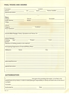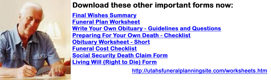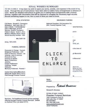I have represented and funded for many funeral homes since 1992. In every case, we used some form of "Memorial Guide," "Record Guide," or other planning guide to put your final wishes and preferences all into one place. A very good one that I recommend is Met Life's Funeral Planning Guide (click here to download PDF). It is very thorough. They offer this when they promote their final expense and group insurance. Over the years, however, I have found it is additionally beneficially to have a one page summarization (which is not intended to replace a more comprehensive document). The reason for the one page summary is to make it easier for your family to look at one piece of paper with the most important information first. It is also easier in most cases for you to think about the most important information first and then to elaborate later. I help you do this with a blank worksheet you can start filling out. If I meet with you, I will take a copy and then put it into printed, easier-to-read form. In addition, I will put a photo of your casket selection on the same page, so when the time comes no one is relying on a written description of what you wanted. Rather, they will see clearly what casket you preferred. There are some other important reasons for having a final wishes summary on one sheet of paper. The most important is to prevent your family from making mistakes, especially costly mistakes. What types of mistakes can happen? They can overspend. This can occur quickly and easily if they choose the wrong funeral home. It is a typical mistake for your family to assume they should be arranging your funeral with the same company where your burial plots are if there is a funeral home at that location also. Examples are Wasatch Lawn, Valley View Memorial Park, Larkin Sunset Gardens, Redwood Memorial, Lake Hills Memorial, Mountain View Memorial and Lakeview Memorial. These are all combined cemetery/mortuary facilities. But they may be way out of your budget for funeral arrangements. If you don't instruct your family with the words, "At time of need contact: The Correct Funeral Home," they will automatically assume you want to use the funeral home where your plots are. The first bits of information under VITAL STATISTICS are for your death certificate. Your survivors may not know or remember your marriage date, etc. Fill this section out first. Social Security number is optional, but it is required at the time of death. You'll also need it to file for the $255 Social Security death benefit. MILITARY RECORD is very important if you are a veteran, because you are entitled to certain benefits if you served with an honorable discharge. One item of considerable expense which veterans get for free is a headstone/marker for your grave, which today for a single person averages around $1,500 to $2,000. See Update on Veteran's Benefits. Decide whether you want a funeral service with a viewing. Remember that with providers such as Premier Funeral Services, and numerous others throughout Utah, you pay much less for having a church service or a graveside service instead of at a mortuary's chapel. Remember that most of the high-profile funeral homes don't give you a discount for using your church, but they will give a small discount for a graveside service. If you decide to use Premier Funeral Services (which could later be changed), be sure to fill that in under "At time of need contact." The details of the funeral service with respect to music, flowers, etc. can be added later, but be sure to indicate who would be in charge of the funeral, such as oldest child, bishop, etc. Selecting the casket style, make, and even model is relatively easy. You can draw the line on cost when you fill in this section. You can either go to my caskets page or go to Walmart or Costco's Web sites. You will find the quality you are looking for at the best prices. Don't visit a funeral home's showroom to shop for a casket. You will be wasting your time. The INSURANCE FUNDING section is where the money to pay for it will come from. If you are freezing costs with me, this would be National Guardian Life Funeral Expense Trust. We would meet to work out the face amount and payment terms. Under INTERMENT REQUESTS, indicate whether and where you have burial plots and if a burial is your preference. If you plan to be cremated and not buried, it would be best not to indicate where you have burial plots. Again, a mistake could be made costing more money if your survivors thought burial was part of the plan. Indicate also whether a vault is already paid for if you're having a burial, as well as grave marker. A grave marker is the last (optional) thing you need, so you can leave this blank for now. And that's it. The more detailed information can be added later on another document. I have NGL's Record Guide, which is a folder with many other details you can outline. Once the Final Wishes Summary is done, make copies and distribute to your family right away. You're that much closer to peace of mind. After the one-page Final Wishes Summary is done, you can elaborate with more details on separate sheets: To add more details, click Each Page to Enlarge and Print: No Funeral Home Pays Me I make less money showing you better alternatives, but that's just the way it goes. This money is paid to me by the funding company I use, National Guardian Life. Funeral homes pay me nothing. No bonuses or commissions are paid to me for promoting any particular funeral service provider. I have my choice of which funeral homes I can represent. These days, I am very picky. I no longer can be lured by bonus money offered by the expensive funeral homes. Let them and their agents bilk seniors. I am only interested in giving your family the best deal for your money, period. I have a handful of funeral service providers (homes) that I would highly recommend. Premier Funeral Services, serving Salt Lake, Davis, and Utah counties, and even in neighboring states, is 